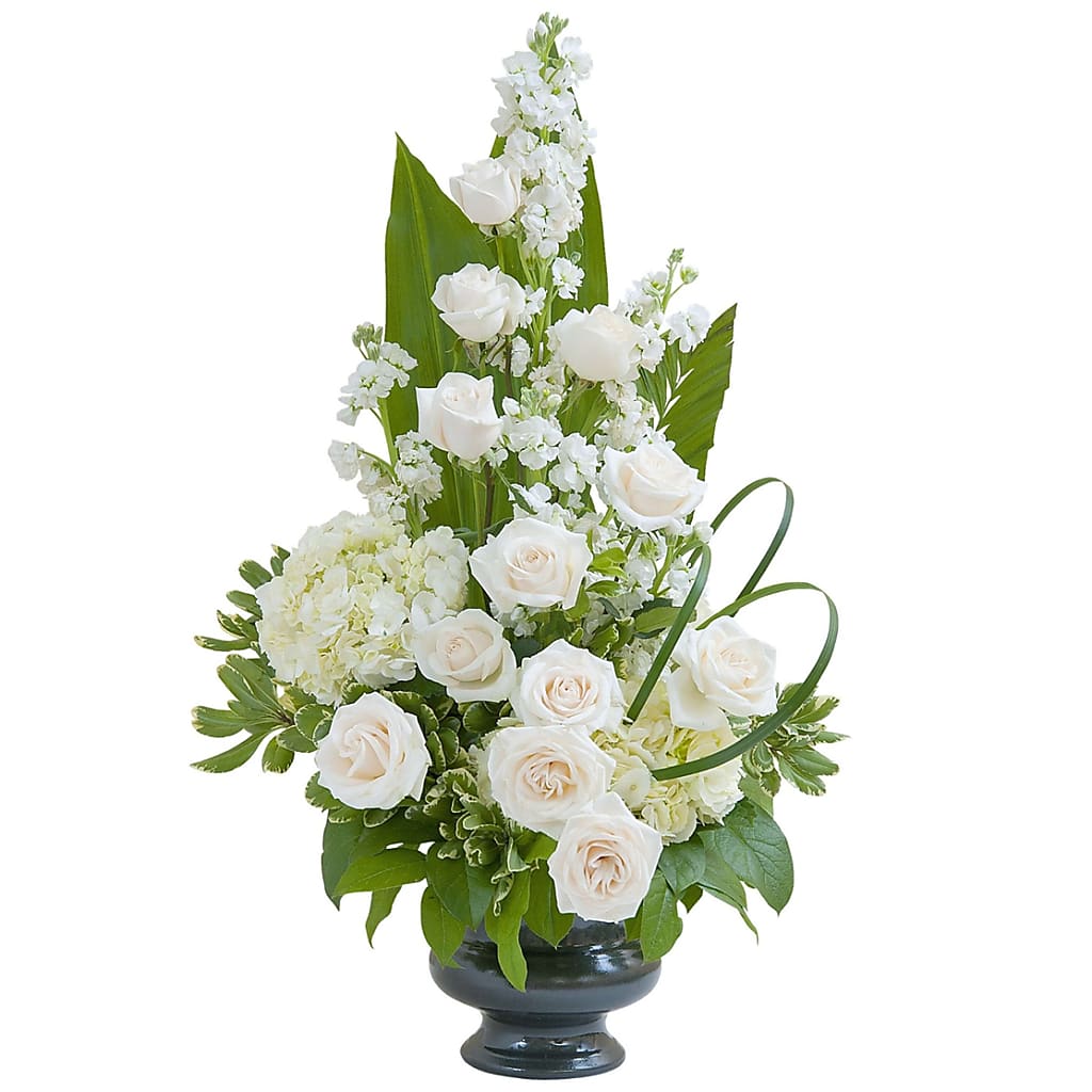 Roses, Hydrangea and Stock combine to make this elegant tribute. As Shown (Deluxe)